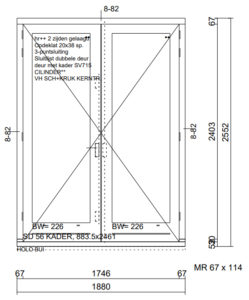 Wordt afgehangen met stapeldorpels aan veiligheidsscharnieren met glij lagers en wordt voorzien van een enkele verbeterde Deventer SV715 tochtkaderafdichting, 3-puntsluiting met krukbediening, inbouw sluitlijst met houten aanslaglatten en veiligheidsbeslag.